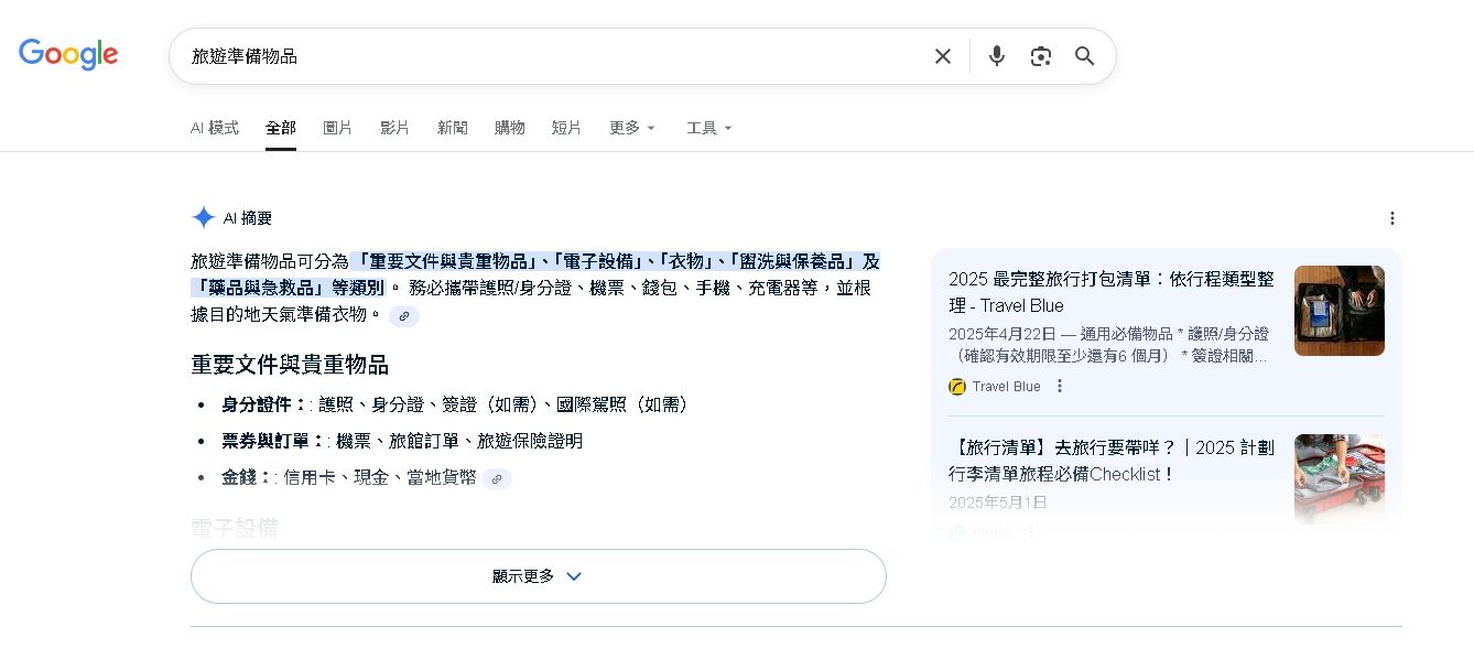 ▲會發現到現在透過google來搜尋,會有AI摘要,甚至還有AI模式,很多人會因為AI摘要而找到想要的答案,就不用點進網站中去找尋答案。值得高興的是,如果深受AI喜愛,就會於右方顯示,就算不是SEO第一頁排名。